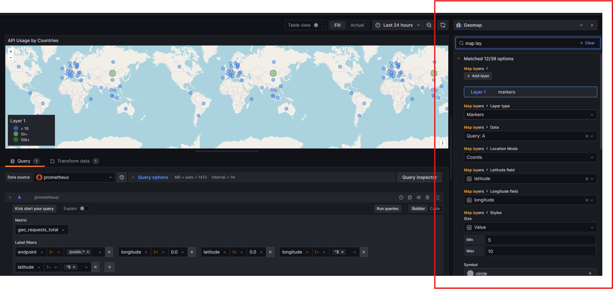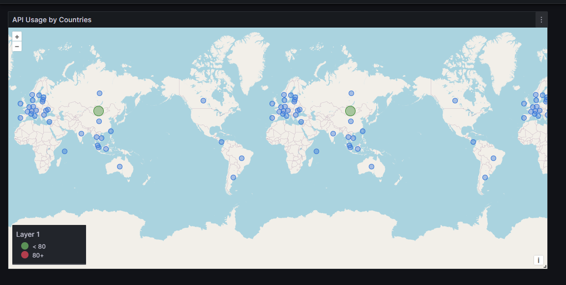 - Calculate the increase in API calls during that specific period of time, which I chose as 1 hour but can use Grafana's built-in $__rate_interval value. This value is shown on the Geomap.