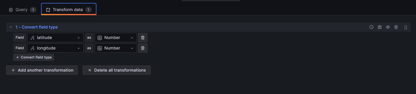 To actually transform that so that our Grafana may understand that they are the value, you must use a transformer of the type "Convert field type". This allows you to interpret those strings (which are considered tags in Prometheus) as numbers.